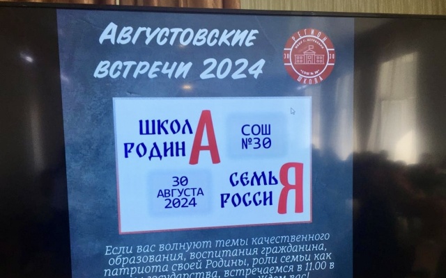 В этот день в рамках августовских педсоветов в школе проходила общая встреча-форум педагогов и родителей "Школа. Родина. Семья. Россия".