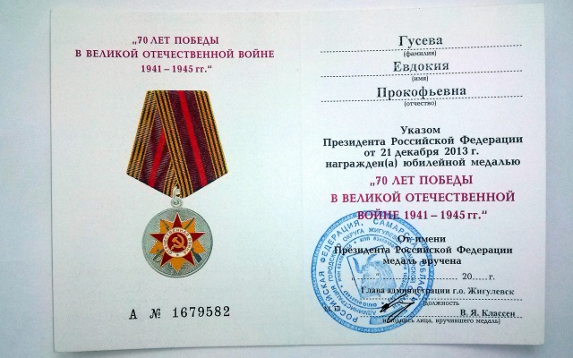 В рамках торжественных мероприятий, посвященных празднованию юбилея Великой Победы в Самарской области Жигулевское городское отделение партии "РОДИНА" совместно с Администрацией города проводят акцию по вручению ветеранам юбилейной медали "70 лет Победы в Великой Отечественной Войне 1941 – 1945 г.г. ".