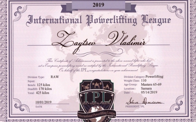 Очерк "Двадцать медалей Владимира Зайцева" был написан для "Ветеранской книги рекордов 2019" совсем недавно, но самарский рекордсмен уже успел значительно пополнить свою коллекцию наград. Так, буквально вчера он получил новый сертификат Международной Федерации пауэрлифтинга IPL сразу на три рекорда Европы по пауэрлифтингу без экипировки в возрастной группе мастеров 65 – 69 лет, в весовой категории до 110 кг в номинациях: "Жим лежа без экипировки" – 125 кг, "Становая тяга без экипировки" – 170 кг, "Классическое троеборье" – 425 кг