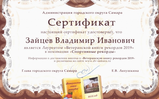 "Ветеранская книга рекордов" издается ежегодно при деятельной поддержке Администрации городского округа Самара. Рассказ о выдающихся спортивных достижениях Владимира Зайцева включен в сборник рекордов 2019 года.